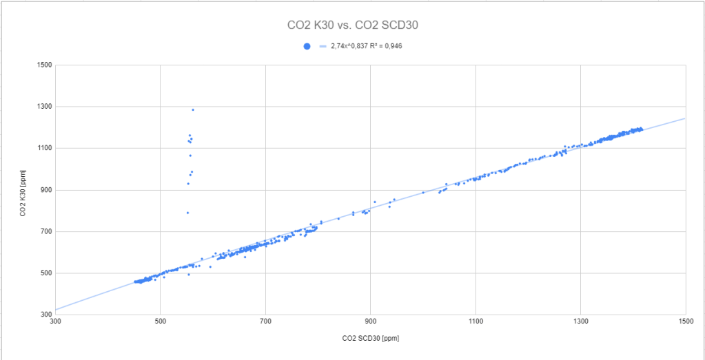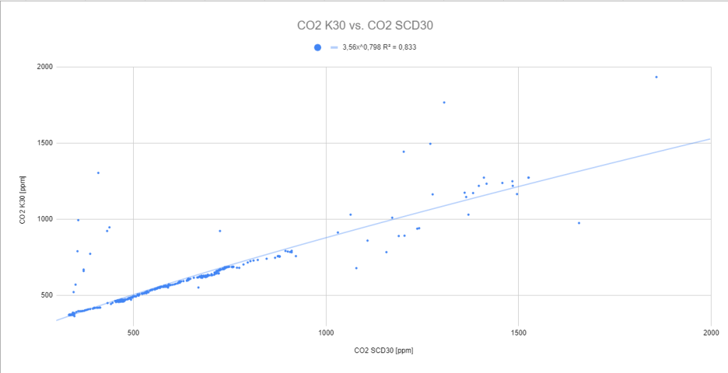 Die beiden NDIR-Sensoren zeigen im interessierenden Messbereich praktisch identische Ergebnisse und sind deshalb als CO₂-Sensoren absolut geeignet, was gerade durch die zweite Abbildung deutlich zum Ausdruck kommt. Die Trendlinie folgt der Beziehung CO₂(K30) = 3.56 * CO₂(SCD30)^0.798 bei einem Korrelationskoeffizienten R2 = 0.883 (Bravais-Pearson-Korrelation).