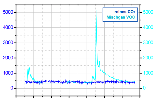 Messverläufe, wie im folgenden Bild gezeigt, sind deshalb absolut vorstellbar. Luftverunreinigungen werden von MOX-Sensoren erfasst und müssen nicht zwangsläufig für den selektiv messenden CO₂-Sensor sichtbar sein.