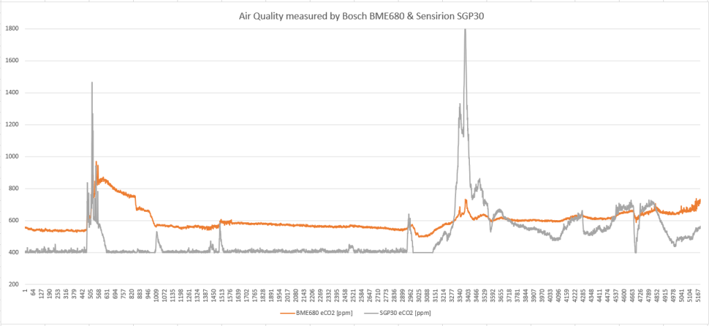 Im Vergleich der eCO2-Werte von BME680 und SGP30 wird die etwas höhere Empfindlichkeit des SGP30 deutlich. Grundsätzlich zeigen aber beide MOX-Sensoren vergleichbares Verhalten.