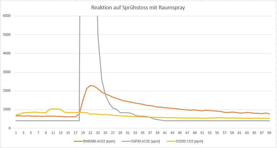 Das breitbandige Verhalten des MOX-Sensors verdeutliche ich beim folgenden Versuch mit einem kurzen Stoss Raumspray in einem gelüfteten Raum. Der Messwert des selektiv messenden NDIR-Sensors zeigt praktisch keine Veränderung, während die Signale der MOX-Sensoren deutliche Reaktion zeigen.