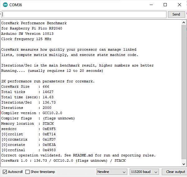 Die Leistungsfähigkeit des RP2040 verdeutlicht ein Benchmark. Für einen Tiny2040 habe ich hier den CoreMark Benchmark verwendet und Cortex-M0+ typische Resultate erhalten.