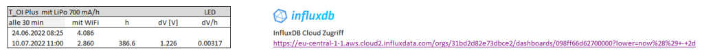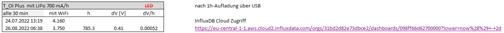 Der Test wurde am 24.06.2022 08:25 mit einer Batteriespannung von 4.086 V gestartet. Abgeschlossen war der Test am 10:07.2022 11:00 nach 386 h bei einer Batteriespannung von 2.86 V.