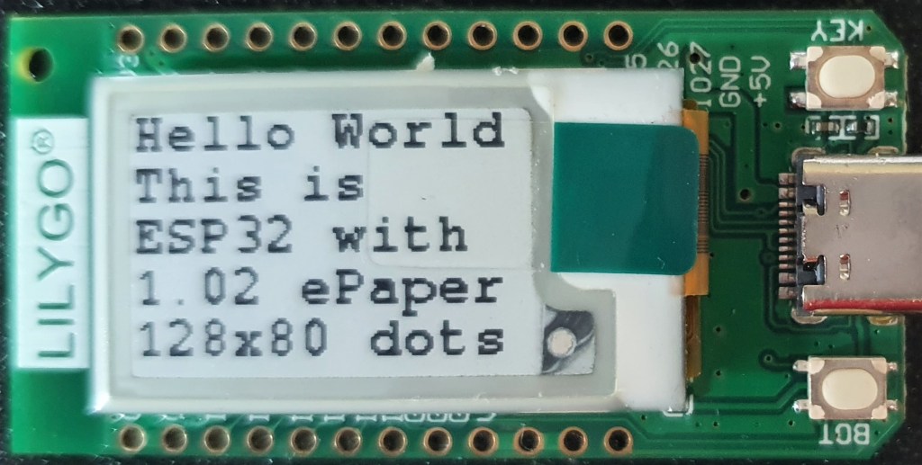 Das Programmbeispiel LilyGo_EPD102_HW.ino zeigt die Ausgabe der oben dargestellten Grafik gefolgt von der hier gezeigten Textausgabe.