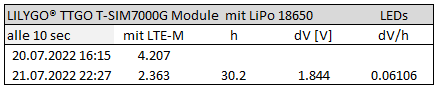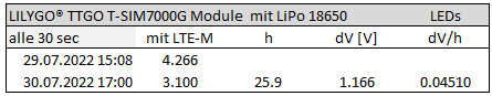 Vor der mobilen Anwendung möchte ich die Laufzeit des LiPo 18650 bei einem Sendeintervall von 10 Sekunden ermitteln. Die folgende Tabelle habe ich dem Testverlauf entsprechend nachgeführt.