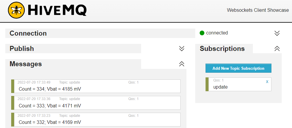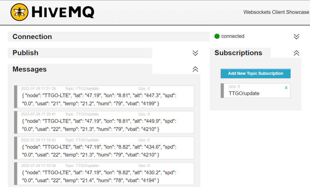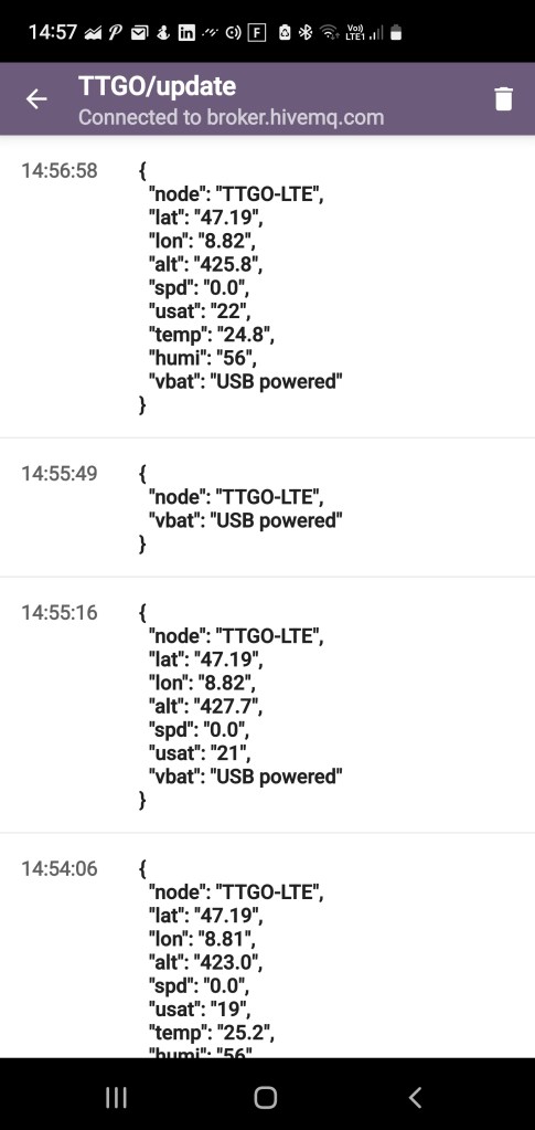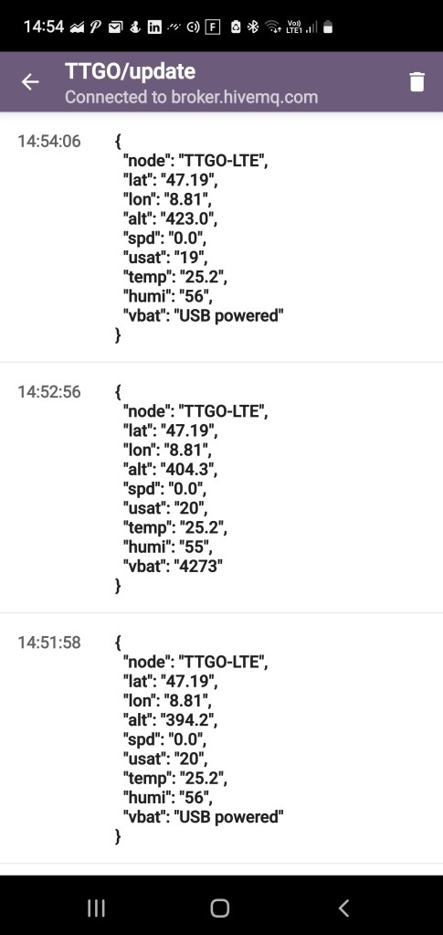 Zum Test der Verbindung aus dem bewegten Fahrzeug verwende ich das Programm TTGO_LTE-M_NetworkTest1.ino, welches an Stelle von Messwerten eine Countervariable und bei Batteriebetrieb die Batteriespannung über MQTT an den Public Broker broker.hivemq.com übertragt.