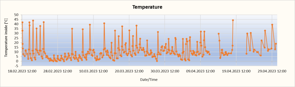 2023-04-26: An der Trendlinie kann eine leicht positive Tendenz abgelesen werden. Das ist bei durchaus durchwachsenem Wetter ein gutes Zeichen. Die Unterbrüche in den Messwerten sind nur durch die manuelle Übertragung bedingt. Der Knoten hat die gesamte Zeit zuverlässig gearbeitet.