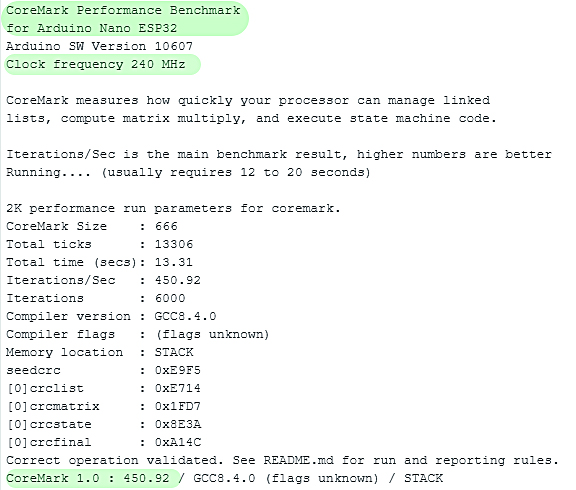 Um einen Eindruck von der Performance des Arduino Nano ESP32 zu bekommen, habe ich den CoreMark Benchmark laufen lassen. Das Ergebnis zeigt den beachtlichen Wert von 450.92, der natürlich nichtzuletzt der hohen Taktfrequenz des ESP32 geschuldet ist.