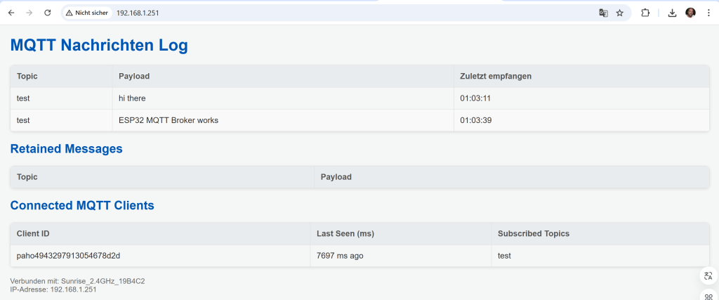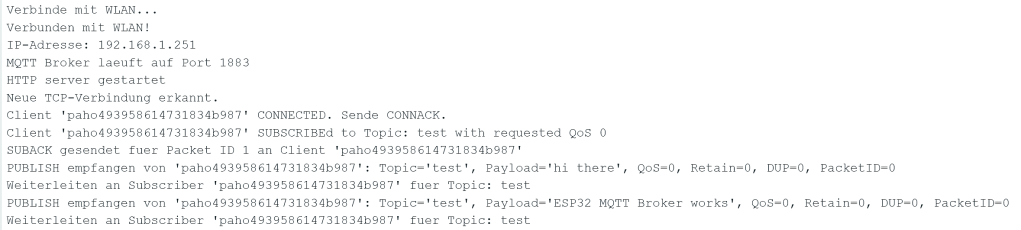 The outputs show the assigned IP address 192.168.1.251 and port 1883 via which you can reach the ESP32 MQTT Broker to query the status.