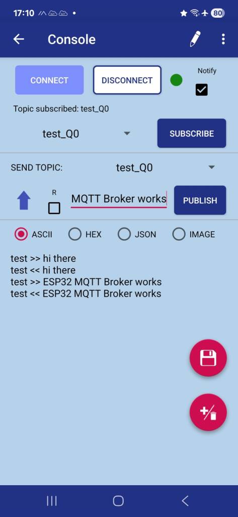Wird eine Nachricht mit dem Topic test empfangen, dann wird diese an den/die Subscriber weitergeleitet und demzufolge auch im MQTT-Client wieder empfangen.