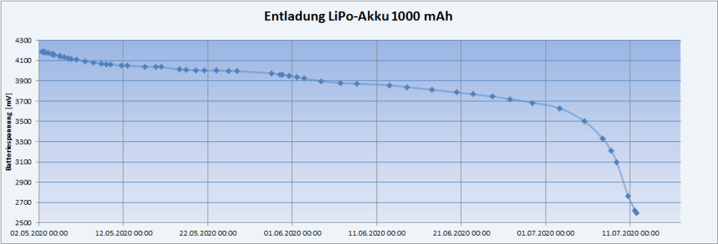 Den oben gezeigten LoRaWAN-Knoten habe ich vom 2.05.2020 bis zum 11.07.2020, das sind 70 Tage, an einem 1000 mAh LiPo-Akku noch ohne Nachladung durch die Solarzelle betrieben.