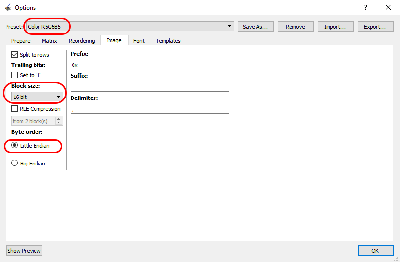 Komplexer ausgestattete Mikrocontroller haben oft eine microSD-Card, auf die Grafikdateien als BMP oder JPG ausgelagert werden können. Der M5StickC/C Plus weist keine solche microSD-Card auf, weshalb das darzustellende Bild im Codebereich gespeichert werden muss. Hierzu gibt es mit dem LCD Image Converter ein sehr komfortables Tool, welches die Bilddaten in Quelltext konvertiert.