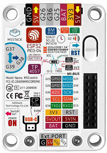 Das 200 x 200 Pixel umfassende E-Ink-Display erhält seine darzustellenden Informationen auch im stromlosen Zustand. Alle weiteren Informationen sind unter https://docs.m5stack.com/#/en/core/coreink?id=coreink zu finden.