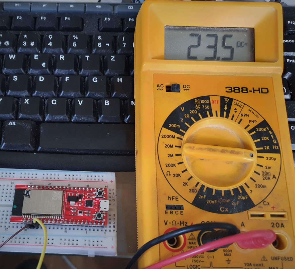 Wie im Display des M5StickC zu erkennen ist, werden Objekt- und Umgebungstemperatur in °C gemessen, sowie der Ladezustand des LiPo-Akkus angezeigt.